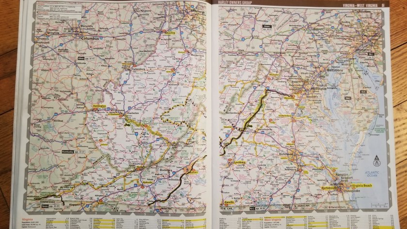 It looks like I’ll be on the Parkway for a long time. That’s fine with me. The dotted path is a possible route into West Virginia, just to say I rode there. The Parkway appears to become Skyline drive, which will take me to a parallel latitude with Washington DC. DC is where the last of my family stops will be for a long time. After that I will get really good at camping.